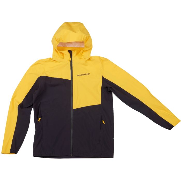 Leichte 2-Lagen Regenjacke von Schöffel in Schwarz-Gelb mit integrierter Packaway-Tasche.